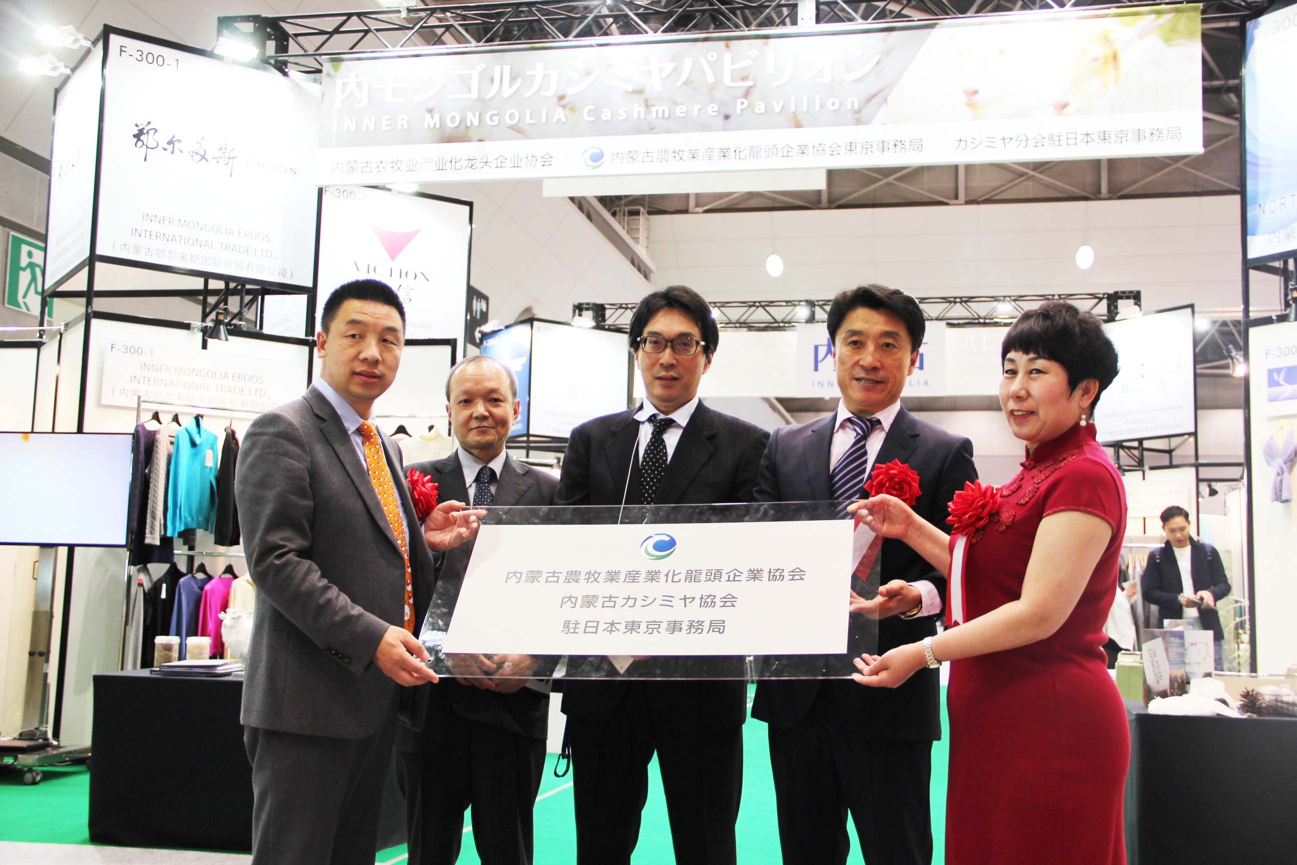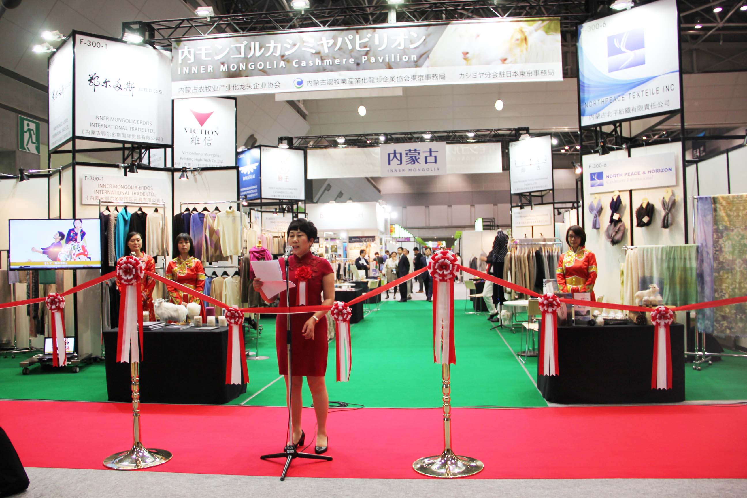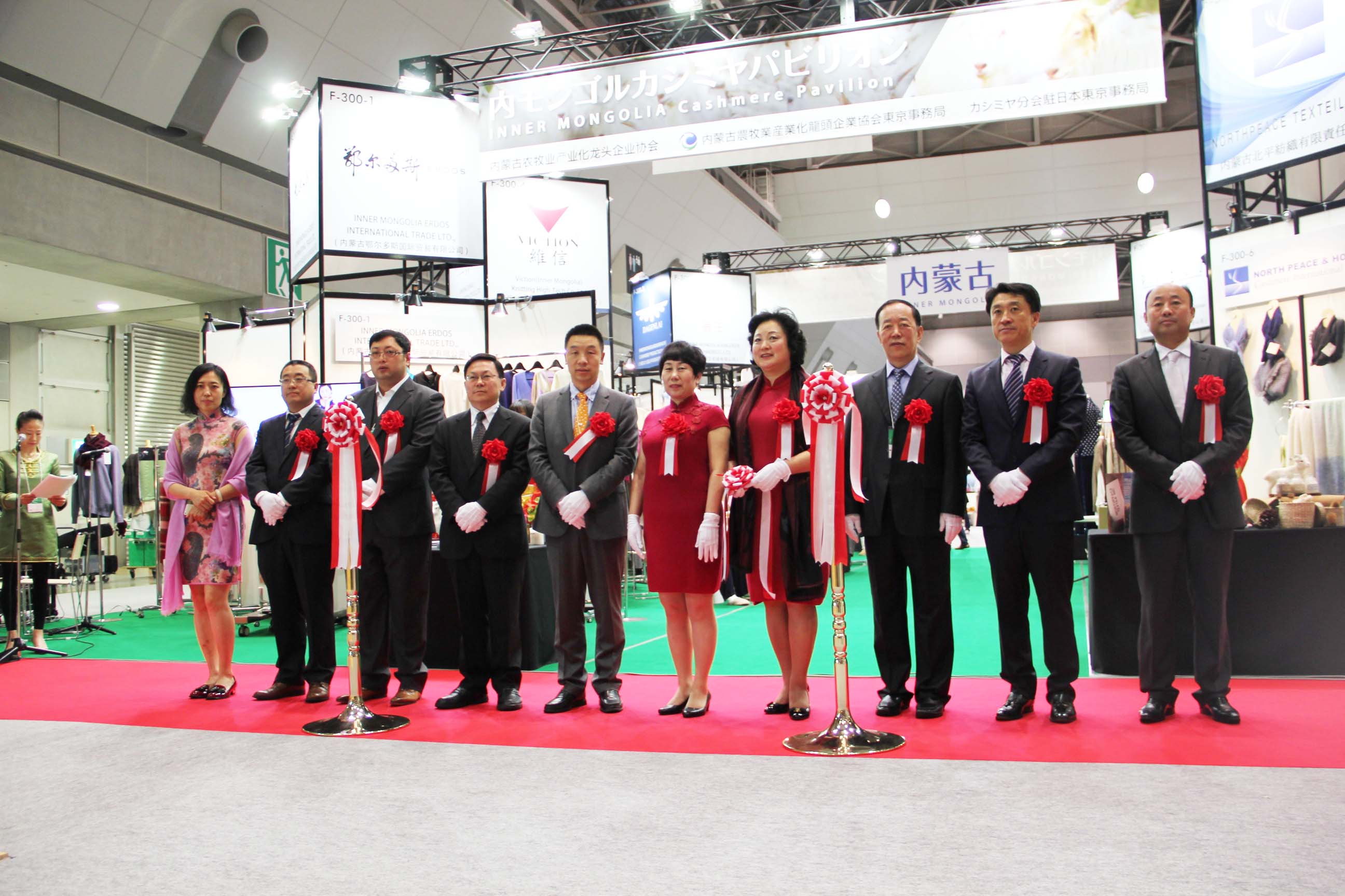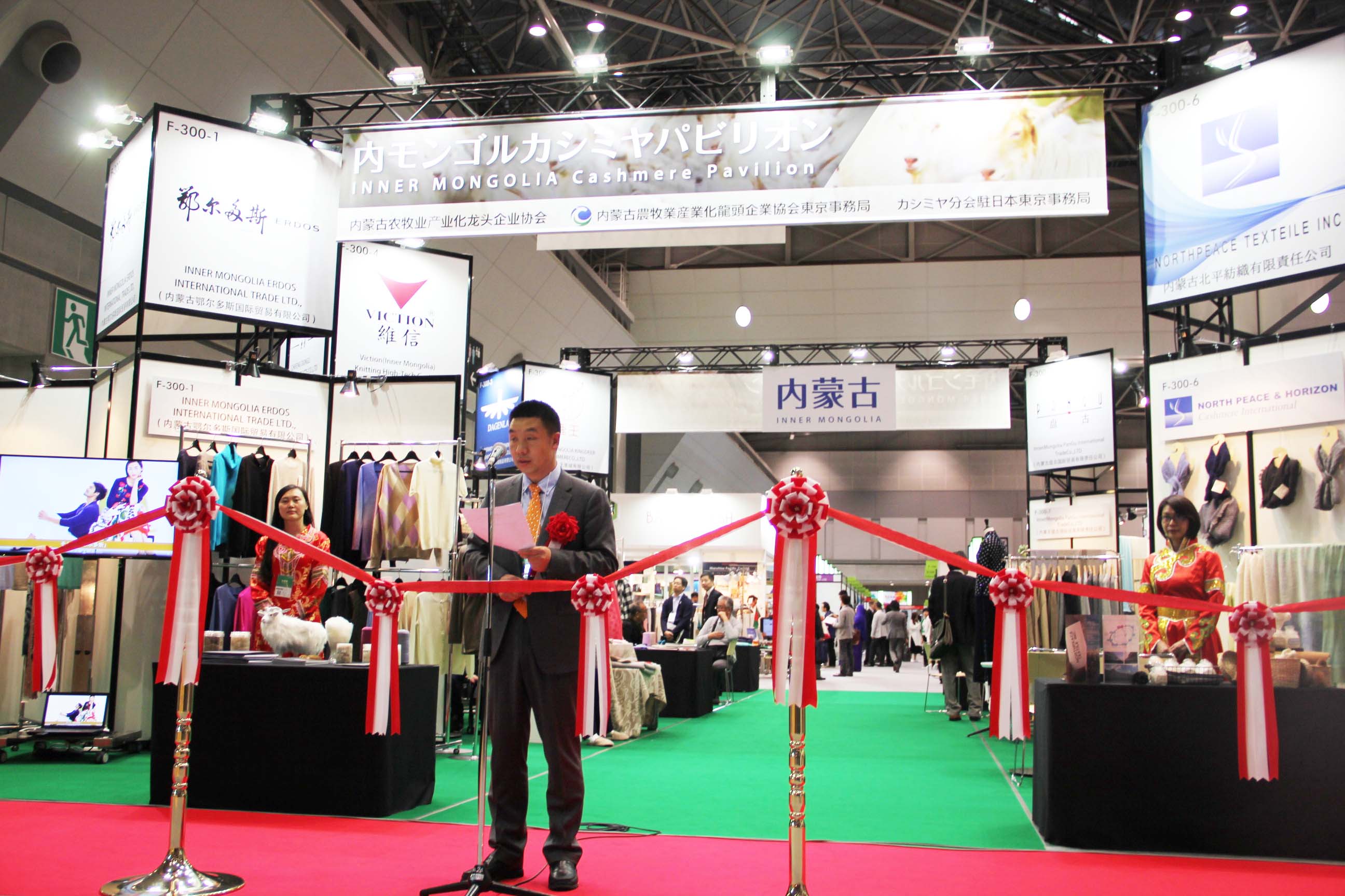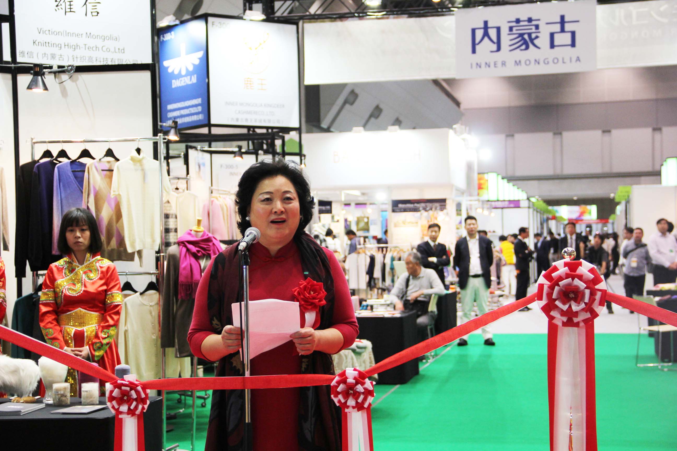 2016426日上午11時(shí),在內(nèi)蒙古羊絨展區(qū)前,舉行了盛大的開(kāi)業(yè)剪彩儀式,內(nèi)蒙古自治農(nóng)牧業(yè)廳產(chǎn)業(yè)化處副處長(zhǎng)郟金梅、內(nèi)蒙古農(nóng)牧產(chǎn)業(yè)化龍頭企業(yè)協(xié)會(huì)會(huì)長(zhǎng)閆樹(shù)春、內(nèi)蒙古農(nóng)牧產(chǎn)業(yè)化龍頭企業(yè)協(xié)會(huì)羊絨產(chǎn)業(yè)分會(huì)會(huì)長(zhǎng)王風(fēng)之出席剪彩儀式,并分別就政府支持、協(xié)會(huì)服務(wù)和企業(yè)自律發(fā)展等幾方面做了精彩致辭。郟金梅副處長(zhǎng)表示,希望通過(guò)此次活動(dòng),使得社會(huì)各界代表能夠贏得機(jī)遇、拓展空間,取得豐碩的成果,同時(shí)真誠(chéng)盼望各方來(lái)賓、新老朋友能夠進(jìn)一步了解內(nèi)蒙古羊絨,認(rèn)識(shí)內(nèi)蒙古羊絨,并以此為契機(jī),加強(qiáng)內(nèi)蒙古羊絨界與日本企業(yè)的合作,攜手發(fā)展,實(shí)現(xiàn)共贏,共創(chuàng)輝煌。閆樹(shù)春會(huì)長(zhǎng)在致辭中講到,我們此行不僅是要展示內(nèi)蒙古羊絨原料優(yōu)勢(shì)地位和行業(yè)加工的專(zhuān)業(yè)性,更希望能充分利用各個(gè)平臺(tái)廣泛交流,探討合作途徑的契合點(diǎn),推動(dòng)兩國(guó)羊絨行業(yè)多方共贏,共同提升全球市場(chǎng)對(duì)羊絨產(chǎn)品的認(rèn)知度,希望我們的羊絨企業(yè)能團(tuán)結(jié)一致,實(shí)現(xiàn)羊絨產(chǎn)業(yè)的可持續(xù)發(fā)展。羊絨產(chǎn)業(yè)分會(huì)會(huì)長(zhǎng)王風(fēng)之在致辭中表示,通過(guò)內(nèi)蒙古農(nóng)牧業(yè)產(chǎn)業(yè)化龍頭企業(yè)協(xié)會(huì)羊絨分會(huì)的平臺(tái),我們勢(shì)必會(huì)在培育超細(xì)超長(zhǎng)型產(chǎn)絨山羊、提升優(yōu)質(zhì)種群的規(guī)模、建立行業(yè)質(zhì)量標(biāo)準(zhǔn)和抱團(tuán)發(fā)展,積極進(jìn)行海外市場(chǎng)渠道、品牌、投資等多方面取得突破性進(jìn)展,致力于將中國(guó)內(nèi)蒙古羊絨打造成為全球性的產(chǎn)業(yè)品牌。