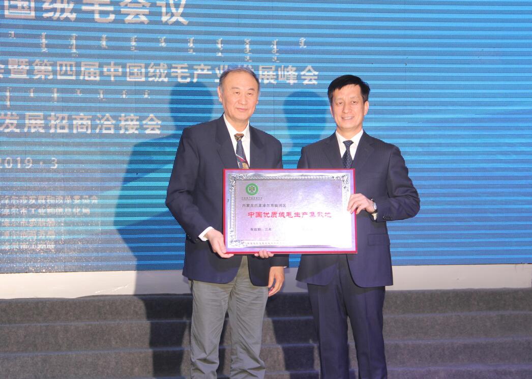 由中國畜產(chǎn)品流通協(xié)會授予臨河區(qū)“中國優(yōu)質(zhì)絨毛生產(chǎn)集散地牌匾”