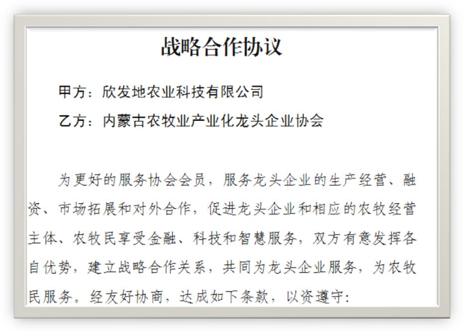 經(jīng)友好協(xié)商,林永亮執(zhí)行會(huì)長(zhǎng)和苗自然董事長(zhǎng)分別代表內(nèi)蒙古農(nóng)牧業(yè)產(chǎn)業(yè)化龍頭企業(yè)協(xié)會(huì)和欣發(fā)地農(nóng)業(yè)科技有限公司,就融資融智、智慧農(nóng)業(yè)、平臺(tái)建設(shè)等項(xiàng)目簽訂了戰(zhàn)略合作協(xié)議,共同為龍頭企業(yè)服務(wù),為農(nóng)牧民服務(wù)。