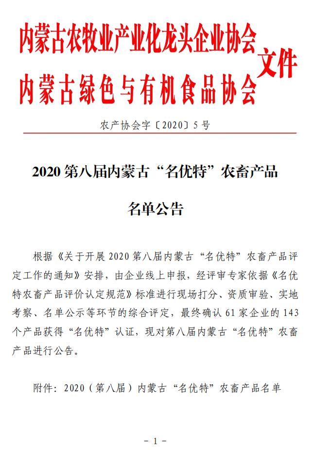 標(biāo)題:2020第八屆內(nèi)蒙古“名優(yōu)特”農(nóng)畜產(chǎn)品名單公告