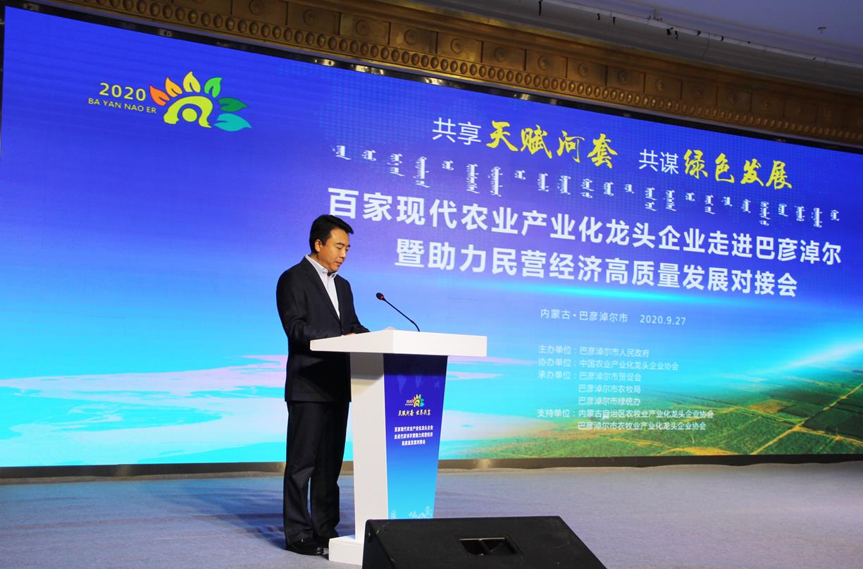 9月27日,由巴彥淖爾市人民政府主辦,中國(guó)農(nóng)業(yè)產(chǎn)業(yè)化龍頭企業(yè)協(xié)會(huì)協(xié)辦,巴彥淖爾市貿(mào)促會(huì)、巴彥淖爾市農(nóng)牧局、巴彥淖爾市綠統(tǒng)辦承辦,內(nèi)蒙古農(nóng)牧業(yè)產(chǎn)業(yè)化龍頭企業(yè)協(xié)會(huì)、巴彥淖爾市農(nóng)牧業(yè)產(chǎn)業(yè)化龍頭企業(yè)協(xié)會(huì)支持,以“共享‘天賦河套’·共謀綠色發(fā)展”為主題的百家現(xiàn)代農(nóng)業(yè)產(chǎn)業(yè)化龍頭企業(yè)走進(jìn)巴彥淖爾暨助力民營(yíng)經(jīng)濟(jì)高質(zhì)量發(fā)展對(duì)接會(huì)在巴彥淖爾市臨河區(qū)召開(kāi)。中國(guó)農(nóng)業(yè)產(chǎn)業(yè)化龍頭企業(yè)協(xié)會(huì)會(huì)長(zhǎng)劉身利,中國(guó)農(nóng)科院紀(jì)檢組組長(zhǎng)史志國(guó),內(nèi)蒙古自治區(qū)黨委巡視二組駐巴彥淖爾市優(yōu)化營(yíng)商環(huán)境專(zhuān)項(xiàng)工作組副組長(zhǎng)董躍飛,巴彥淖爾市委副書(shū)記、市長(zhǎng)張曉兵,市人大常委會(huì)主任閆鵬,市委副書(shū)記、政法委書(shū)記李中增,市委常委孫艾芳、王志平出席會(huì)議,副市長(zhǎng)任逸群作市情推介,內(nèi)蒙古農(nóng)牧業(yè)產(chǎn)業(yè)化龍頭企業(yè)協(xié)會(huì)會(huì)長(zhǎng)周勇應(yīng)邀出席會(huì)議。