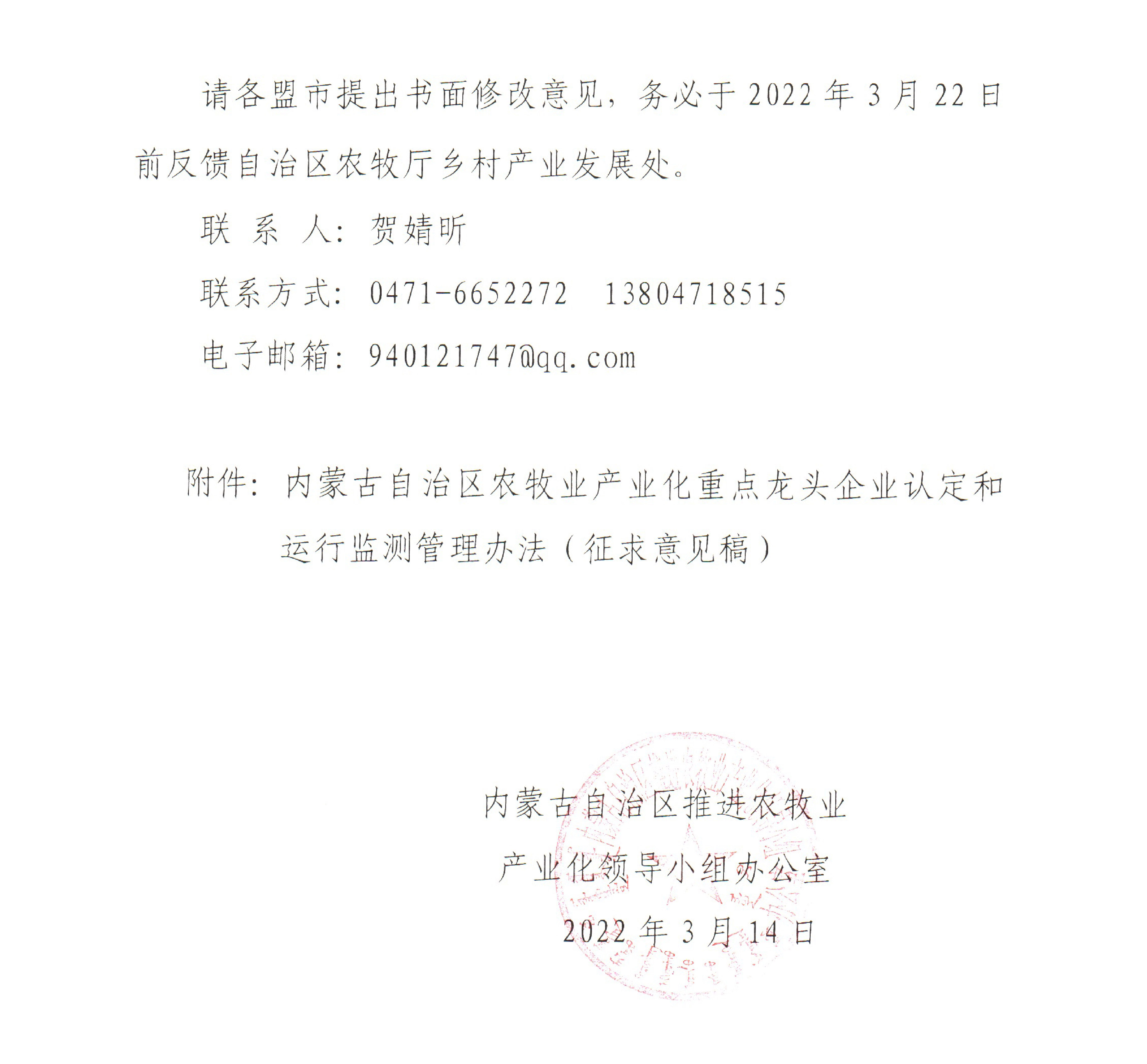 標題:關(guān)于征求修訂《內(nèi)蒙古自治區(qū)農(nóng)牧業(yè)產(chǎn)業(yè)化重點龍頭企業(yè)認定和運行監(jiān)測管理辦法(征求意見稿)》修改意見的函