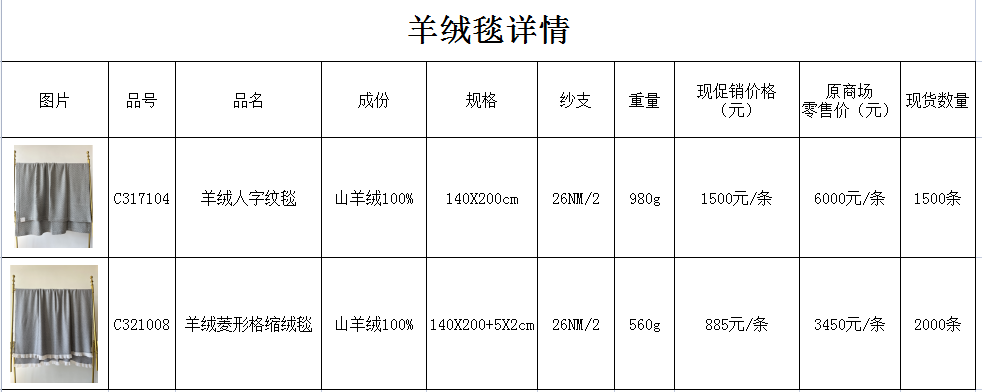 現有協會副會長單位內蒙古大盛業(yè)羊絨制品有限公司生產的羊絨人字紋毯1500條,羊絨菱形格縮絨毯2000條,春節(jié)特價大酬賓,具體規(guī)格如下圖:
