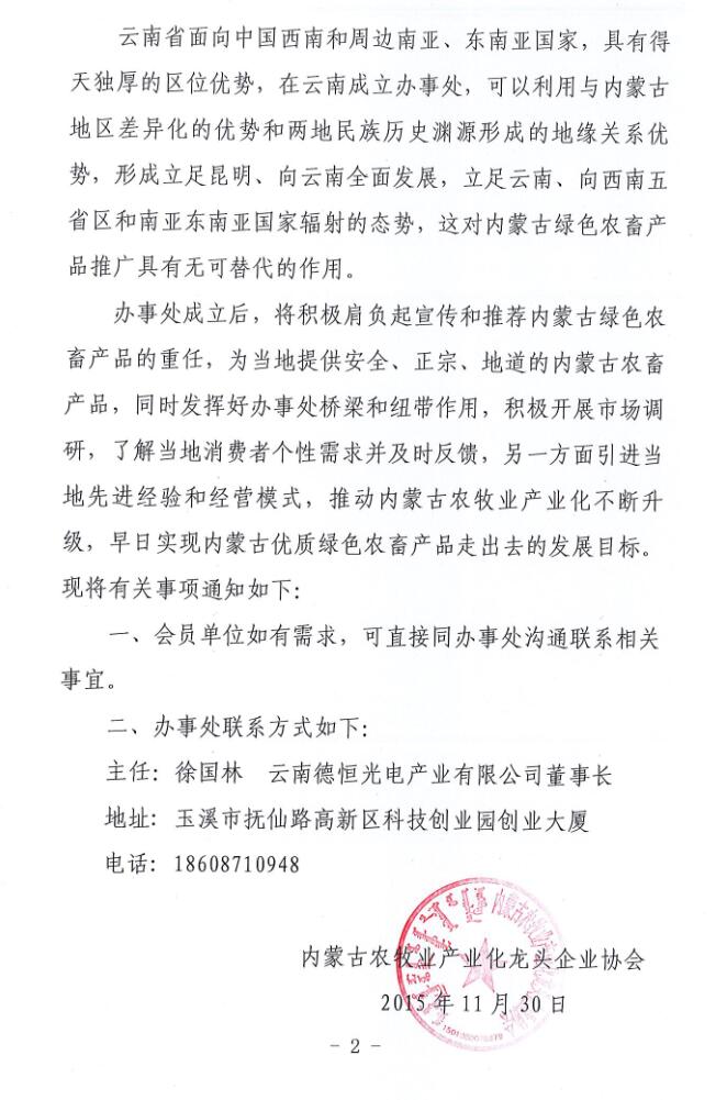 關(guān)于成立內(nèi)蒙古農(nóng)牧業(yè)產(chǎn)業(yè)化龍頭企業(yè)協(xié)會云南辦事處的通知