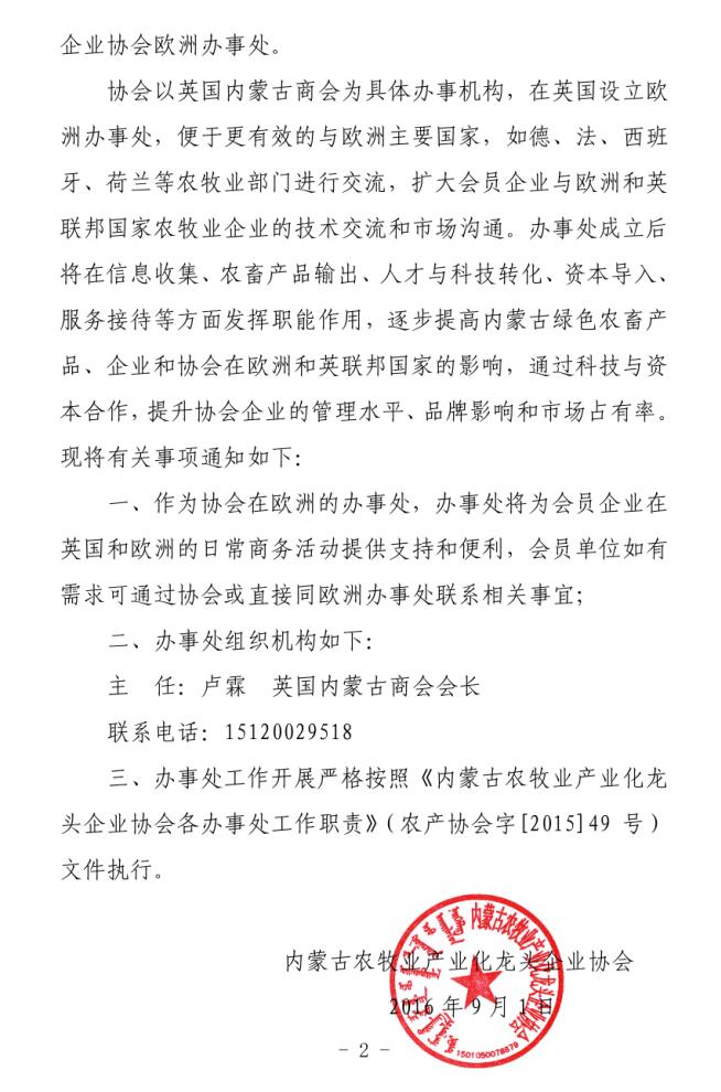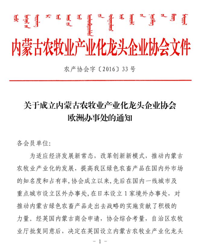 關(guān)于成立內(nèi)蒙古農(nóng)牧業(yè)產(chǎn)業(yè)化龍頭企業(yè)協(xié)會歐洲辦事處的通知