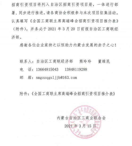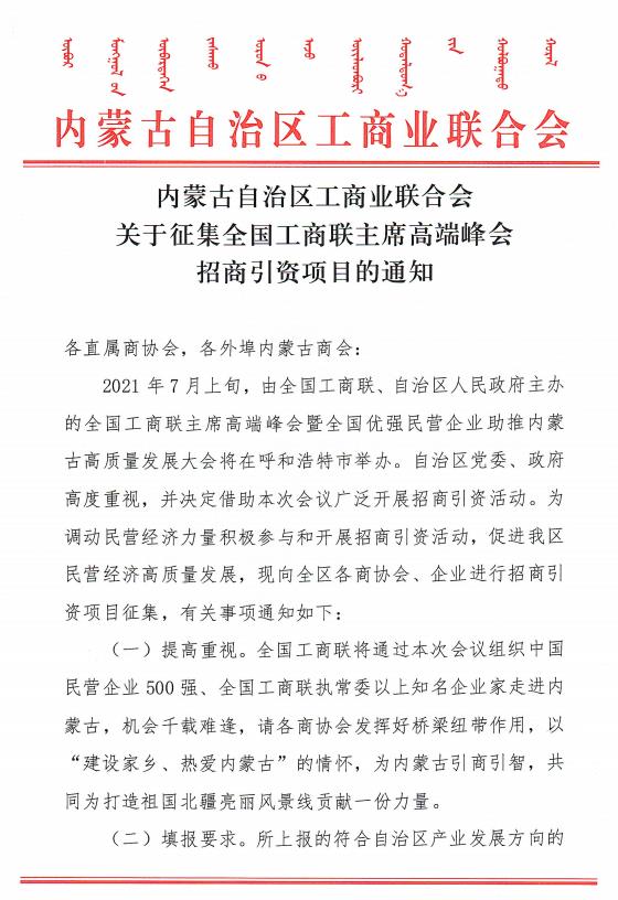 轉(zhuǎn)發(fā):內(nèi)蒙古自治區(qū)工商業(yè)聯(lián)合會(huì)關(guān)于征集全國(guó)工商聯(lián)主席高端峰會(huì)招商引資項(xiàng)目的通知