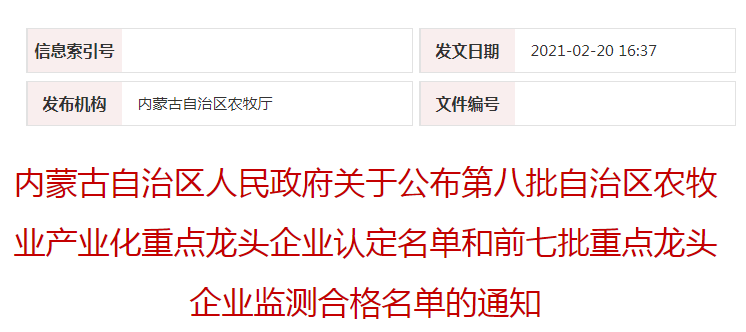企業(yè)名稱:內(nèi)蒙古自治區(qū)人民政府關(guān)于公布第八批自治區(qū)農(nóng)牧業(yè)產(chǎn)業(yè)化重點龍頭企業(yè)認(rèn)定名單和前七批重點龍頭企業(yè)監(jiān)測合格名單的通知