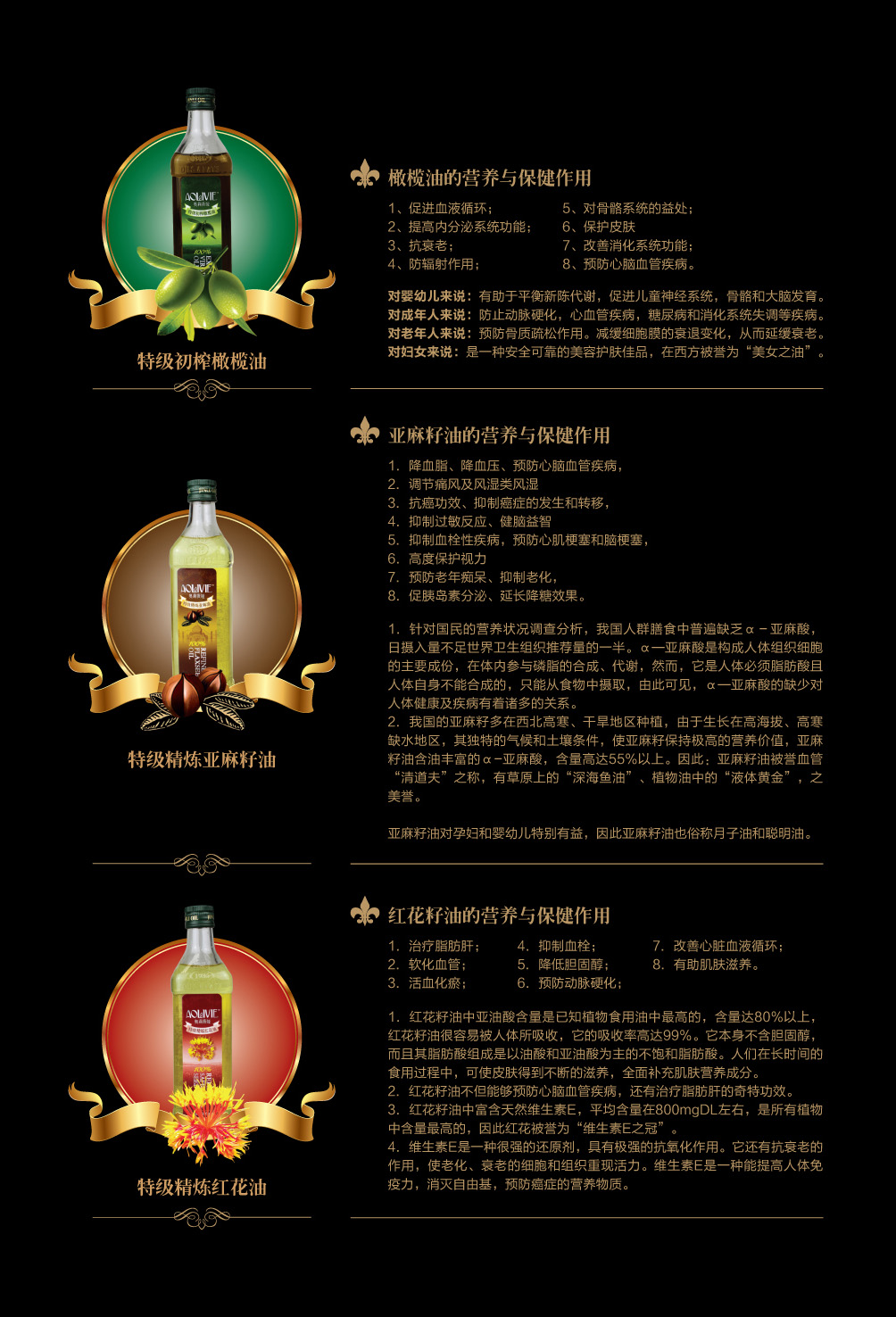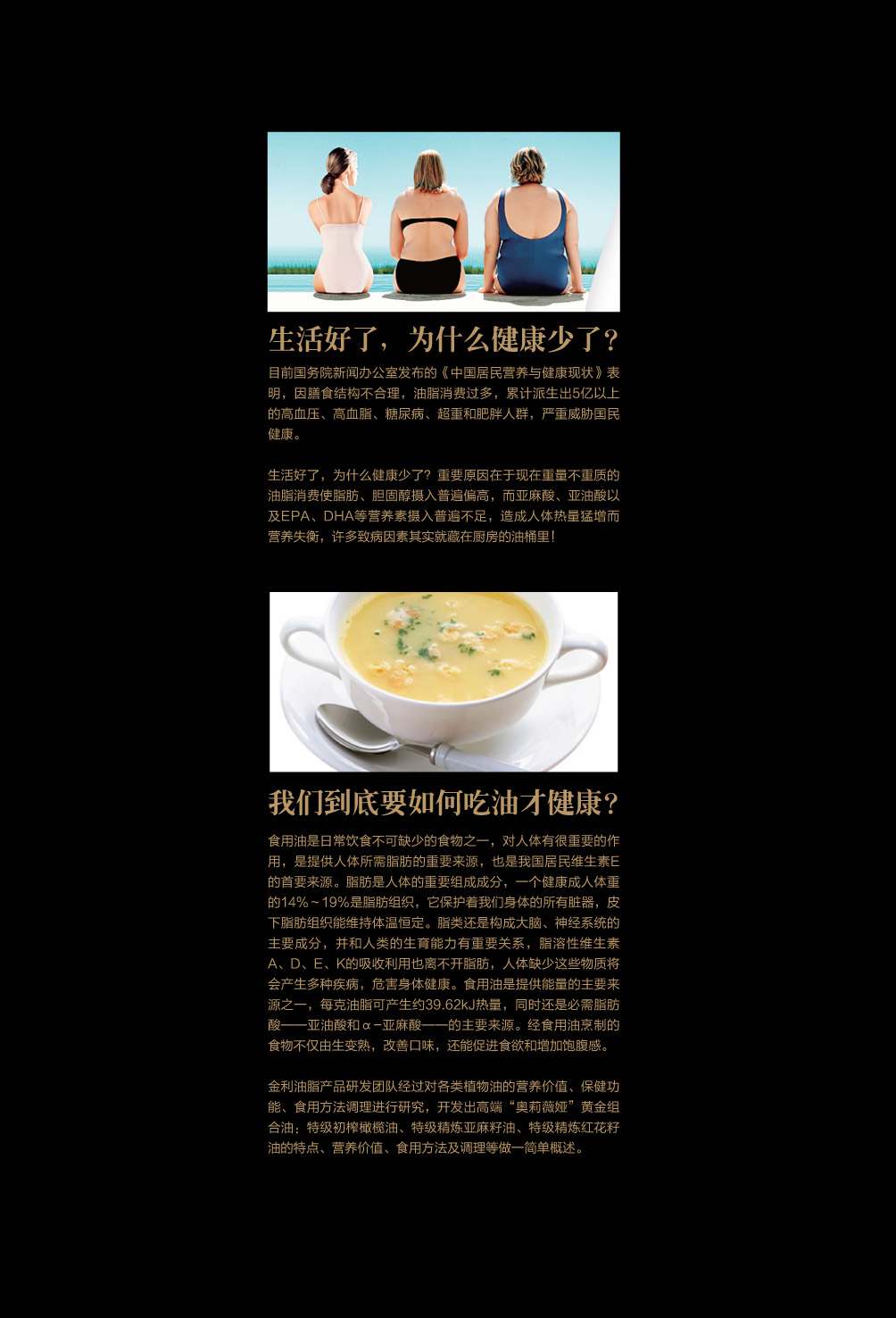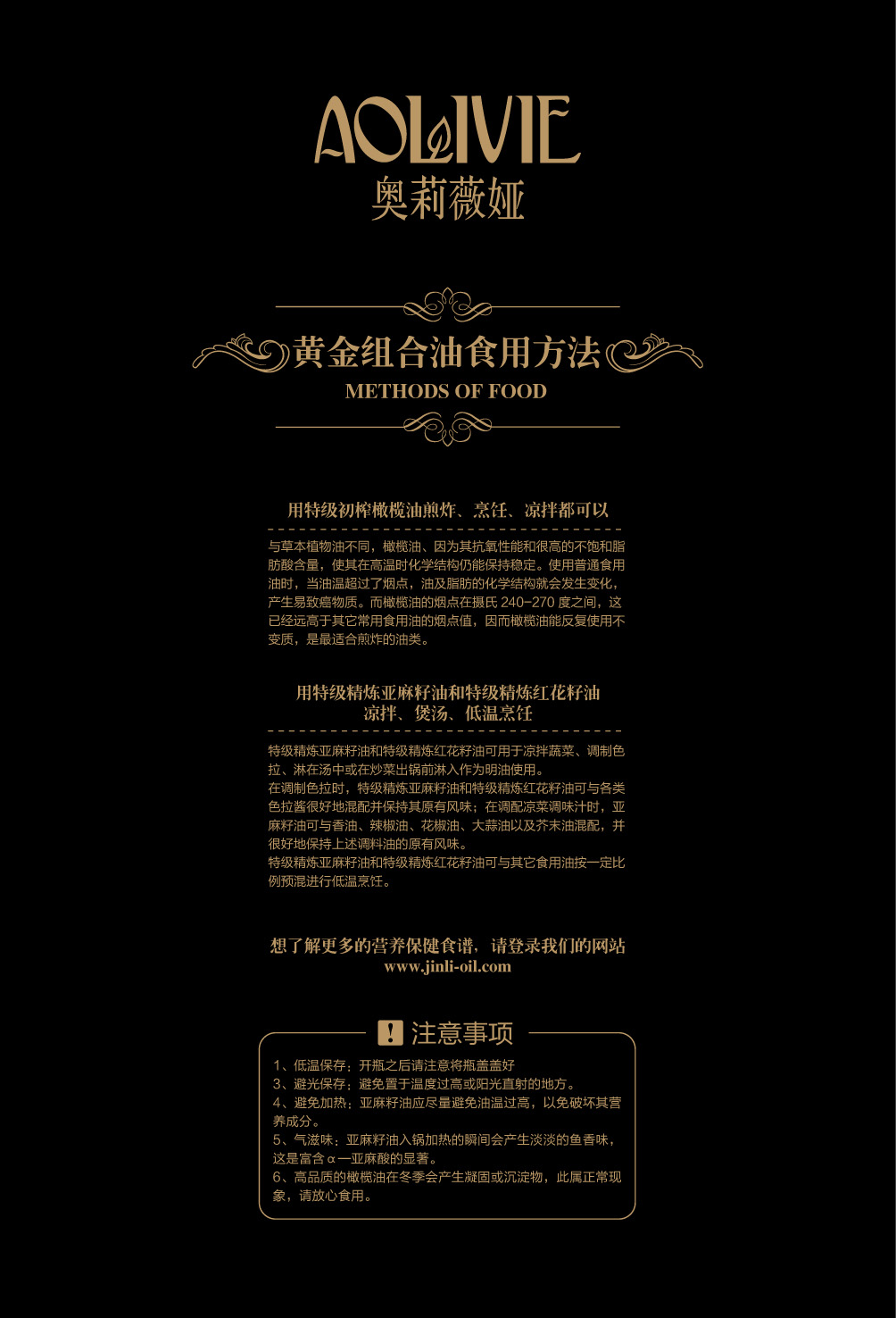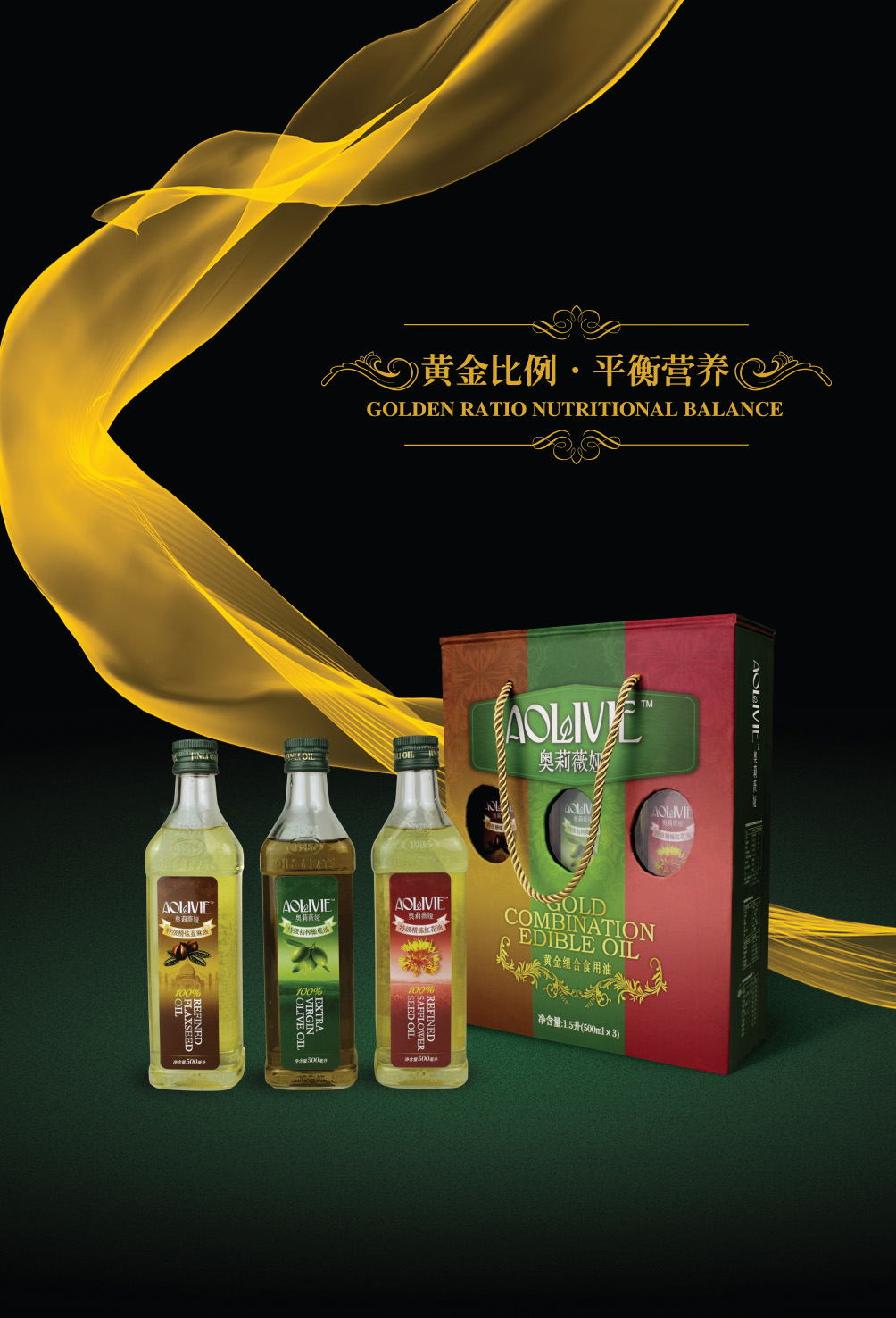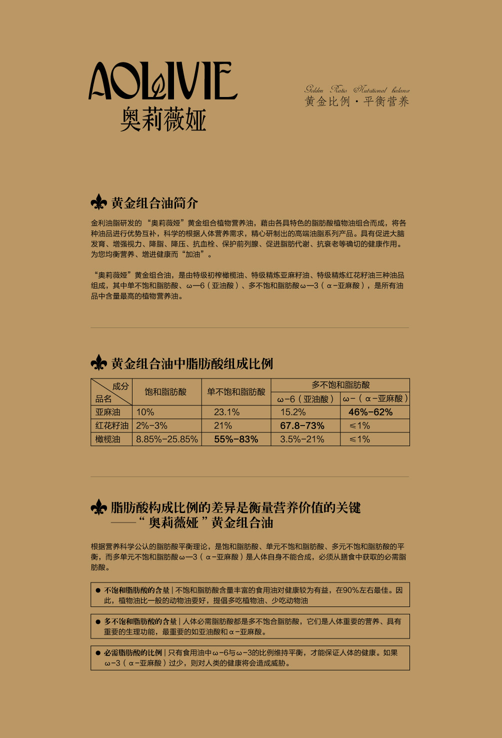 金利油脂(蘇州)有限公司研發(fā)的:“奧莉薇婭黃金組合植物營養(yǎng)油,有各具特色的脂肪酸植物油組合而成,將各種油品進行優(yōu)勢互補,科學(xué)的根據(jù)人體營養(yǎng)需求,精心研制出的高端油脂系列產(chǎn)品。具有促進大腦發(fā)育/增強視力/降脂/降血壓/抗血栓/保護前列腺/促進脂肪代謝/抗衰老等良好的保健作用。為您均衡營養(yǎng)/增強體質(zhì)而“加油”?!皧W莉薇婭黃金組合油,是有特級初榨橄欖油/特級冷榨亞麻籽油/特級精煉紅花籽油三種油品組成,其中單不飽和脂肪酸/α—亞麻酸和亞油酸,是所有植物油中含量最高植物營養(yǎng)油。