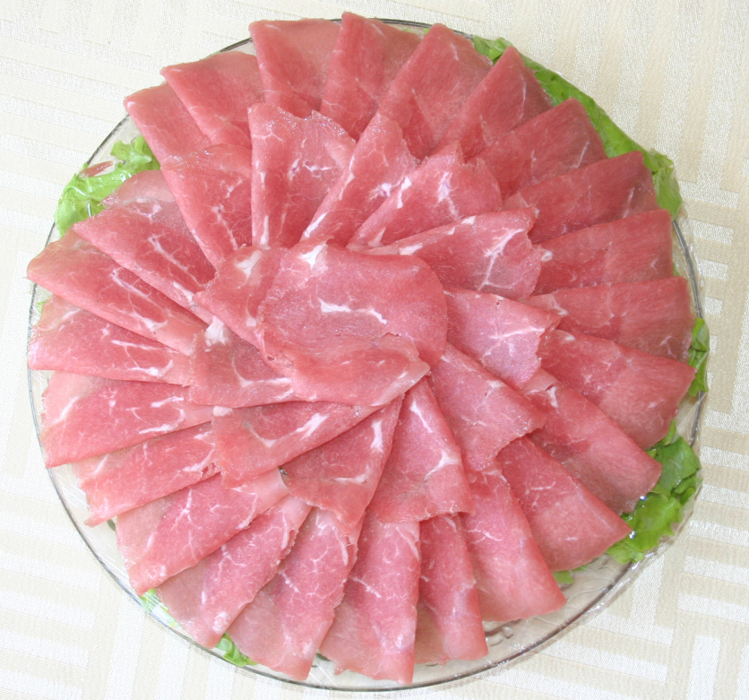 十六、太陽卷:選用原料:精選后的上腦下五指寬的排圍邊,卷制而成。特點:白圍邊,紅內(nèi)襯。切片之后紅白相稱,形似太陽,肉質(zhì)鮮嫩。羊肉產(chǎn)品中的極品。