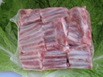 用羔羊肉排作原料,將羊排兩端鋸齊后順兩根肋骨中間方向平行下鋸,鋸成長寬尺寸為4cm*4cm的正方形。鋸骨完成后去除表面骨渣和肉沫。