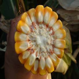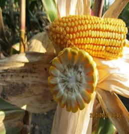 春播區(qū)從出苗至成熟126天左右。株型緊湊,株高271-286cm,穗位96cm。穗行數(shù)16-18 行,紅軸,果穗整齊、均勻;出籽率高達(dá)90%,軸細(xì)、粒深;長勢整齊一致,不空桿,產(chǎn) 量年度間差異小,穩(wěn)產(chǎn)性好。