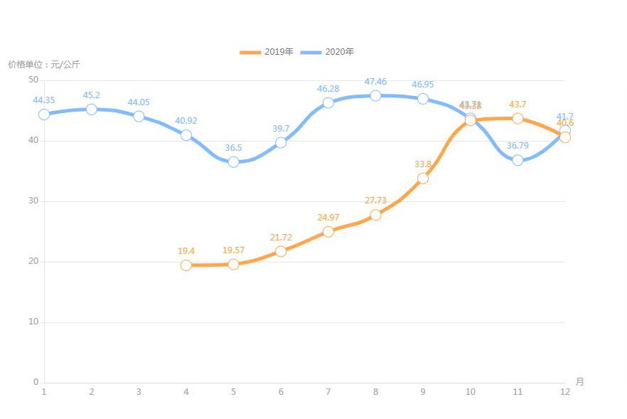 豬肉(白條豬)最高價(jià)格出現(xiàn)在2020年12月40.79元/公斤,最低價(jià)格出現(xiàn)在2019年2月13.67元/公斤。