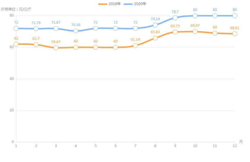 據(jù)農(nóng)業(yè)農(nóng)村部對(duì)全國(guó)500個(gè)集貿(mào)市場(chǎng)監(jiān)測(cè),2020年12月第二周,全國(guó)羊肉價(jià)格為每公斤82.66元,連續(xù)八周上漲,同比上漲3.6%。業(yè)內(nèi)人透露,目前,養(yǎng)羊成本上升;人們對(duì)羊肉品質(zhì)的要求也越來(lái)越高,消費(fèi)者更加傾向于選擇有質(zhì)量認(rèn)證標(biāo)志和品牌的羊肉產(chǎn)品,特別是優(yōu)質(zhì)、味美的新鮮羊肉,加上羊肉產(chǎn)量不高,供應(yīng)不足,拉動(dòng)了羊肉價(jià)格上漲。