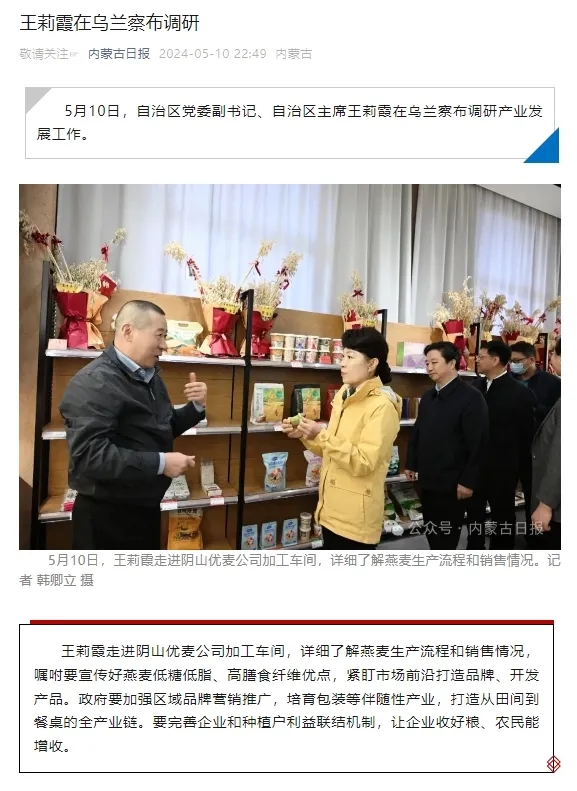 5月10日,自治區(qū)黨委副書記、自治區(qū)主席王莉霞深入內(nèi)蒙古陰山優(yōu)麥?zhǔn)称酚邢薰究疾煺{(diào)研。